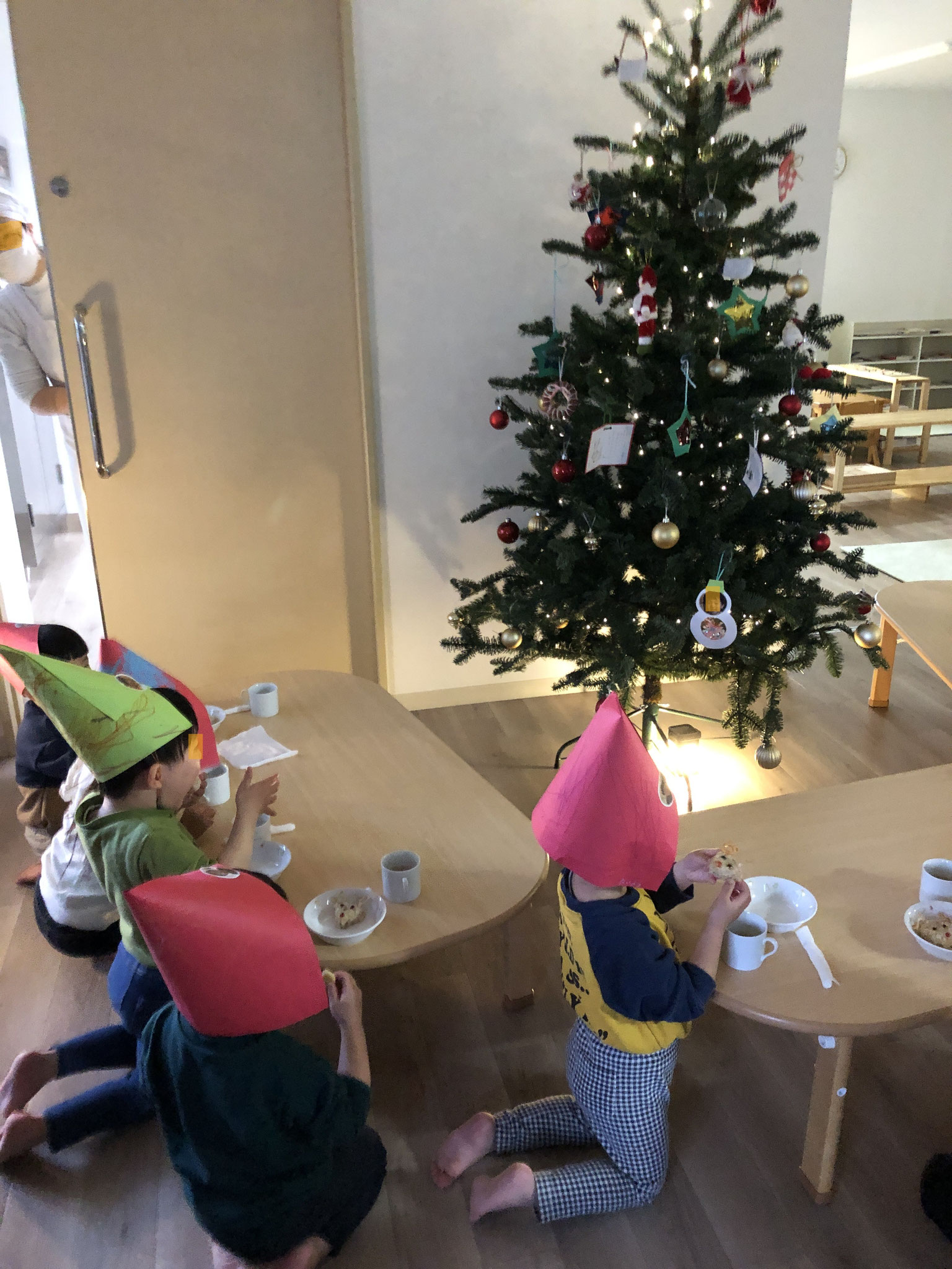 めずらしく、雨のクリスマスイブでしたね。こどもたちは、室内で楽しく過ごしました。 赤と緑の千代紙をちぎって、段ボールでパタパタ仰いだり、寝転がって泳いでみたり… 調理室からは、素敵な贈り物が♪ クリスマスメニューのおやつです。みんなでツリーを眺めながら、楽しくいただきました。...