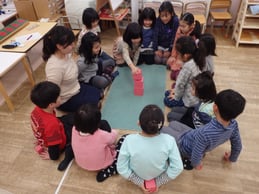『桃色の塔』『茶色の階段』『赤い棒』等のおしごとを久しぶりに触り、やり方は忘れてしまっていても、感覚はしっかりと残っていたようで、活動を発展させて少し難しい活動も、よく感覚を使って楽しんでいました。分数では、『鉄製はめこみ分数』というおしごとを使って、分数の概念を知りました。リンゴを使ってみんなで、何分の何になるか考えながら切り、最後においしくいただきました。