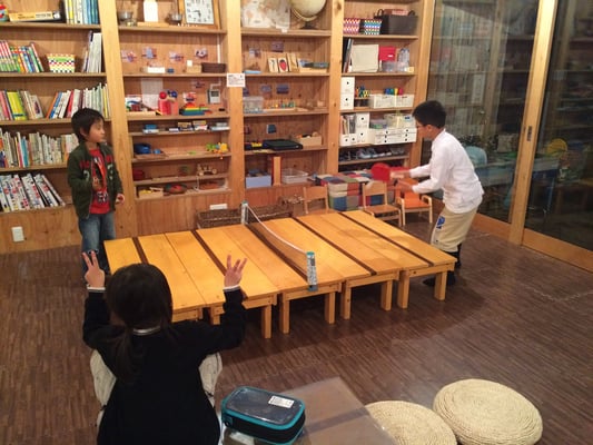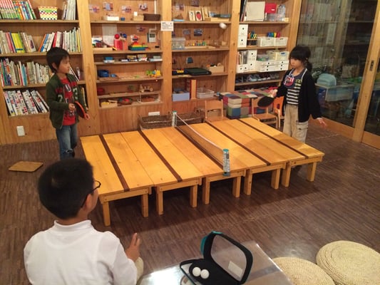 しかし11月頃から更に日暮れが早くなり寒さも本格化、探検もなかなか大変になってきます。室内で過ごす時間も多くなり、こども達にも新しい刺激が必要だと考え、卓球台セットを出してみたところ、すごい盛り上がりを見せております。何と手づくりの座卓を5つ並べると、本物の卓球台とほぼ同じサイズに!(ひくいけど)