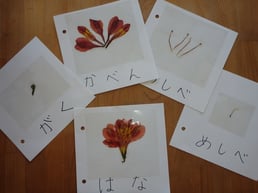 一つ目は、花の絵に部分ごと色を塗って作った本、もう一つは、電子レンジで即席押し花を作り、本物の花を使った本を作りました。
