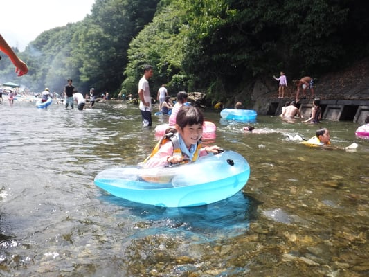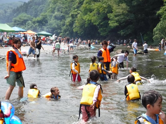 天気に恵まれとても暑かったため、最高の川遊び日和でした。少し高い岸から川へダイブ!網を持って魚を捕まえる!浮き輪に乗って自由気ままに流される!時間を忘れて思いっきり遊びました。お昼のお弁当はひとつのシートにみんなで座り、わいわい楽しく食べました。