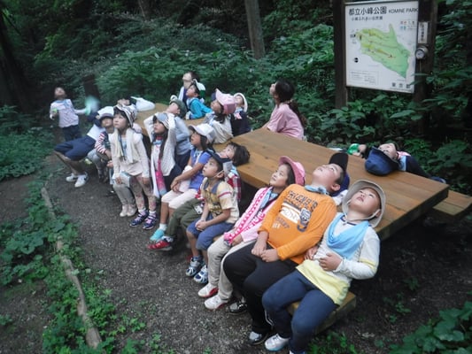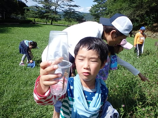 次の小峰公園では、豊かな自然環境の中で、紙コップを片手に昆虫採取をしました。たくさんの種類の昆虫がいたので男の子はもちろん、女の子も夢中になって追いかけていました。虫を捕ったこどもたちの「ねぇねぇ見て見て!」が止まりませんでした! 森の中にある自然クーラーの中で目を閉じ、『一分を感じる』といった静の活動も行いました。都会の生活ではなかなか出会えない貴重な体験ができました。