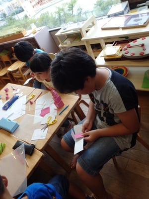 10個も大きさの違う立方体を作るには根気が必要です。みんな「疲れた」「もうだめかもしれない…」と言いながらも、手はしっかり動かして、完成に向けて頑張っていました。