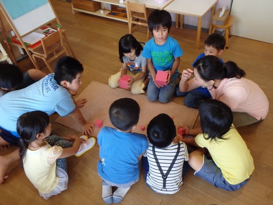 小学生になった皆さんは、目隠しをして触覚だけで、順番を当てたり、桃色の塔の大きさの秘密(1㎝³から10㎝³の立方体)や、桃色の塔の展開図を知り、最後には自分だけのオリジナル桃色の塔を作りました。