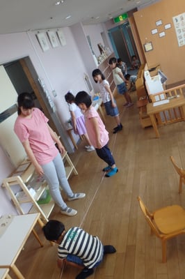 次に、150㎝までのメジャーをつなげていき、玄関からひよこのお部屋までの長さを測ってみました。なんと、その長さは24m!大人もこどもたちも驚きました。