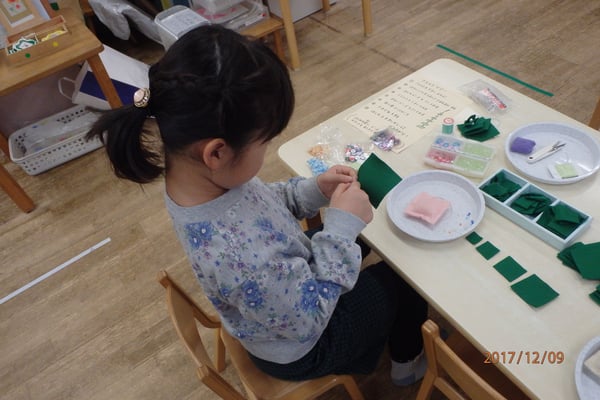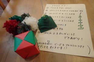 フェルトツリーでは、それぞれが好きなビーズを縫い付けていて個性豊かな作品になっていました。多面体折り紙は、一度折り方を覚えるとあとは自分で折り、組み立てて仕上げていました。毛糸のポンポンリースでは、ポンポンを丸くするために細かくカットするなどこだわる姿もありました。