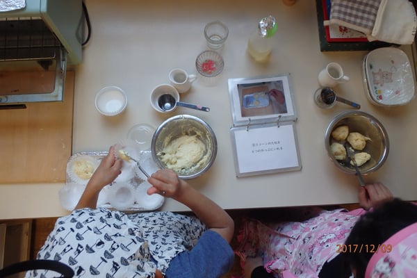 水や油を入れて混ぜたり、4等分にしたり、飾りを付けたりと手順の書かれた本を見ながら、手際よく進める姿に、さすが小学生だな~と感心しました。
