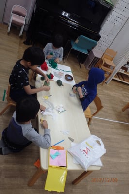4人がスコーン作りをしている間に、待っている人たちはクリスマスの飾り作りをしました。