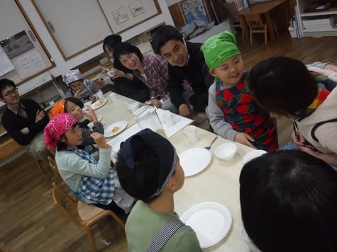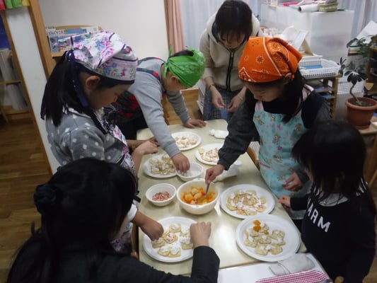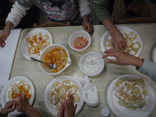 3つ目は、パーティーの準備です。クラッカーに、生クリームやマシュマロ、バナナ等をトッピング。それとヨーグルトもトッピングアレンジをして準備完了。みんなで乾杯をして、楽しいひと時を過ごしました。