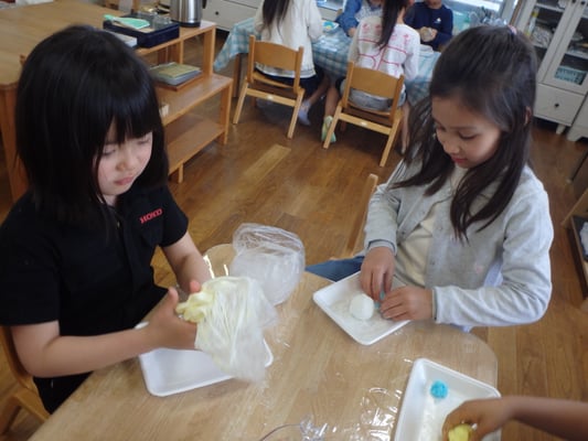 せっけんづくりでは、白・黄・青の中から自分の好きな色を1つ選んでつくり、自分の色をあげたり、人の色をもらったりしてデザインしたせっけんを完成させました。