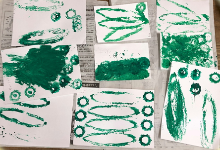 どんな模様になるかドキドキしながらスタンプ。これが、海の何かに大変身します♪