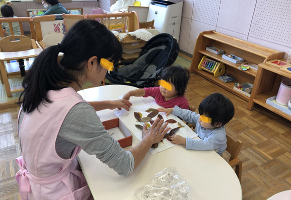 葉っぱをのりで紙に貼ってみると、初めての感触に不思議そうな顔をする0歳児クラスのこどもたち。