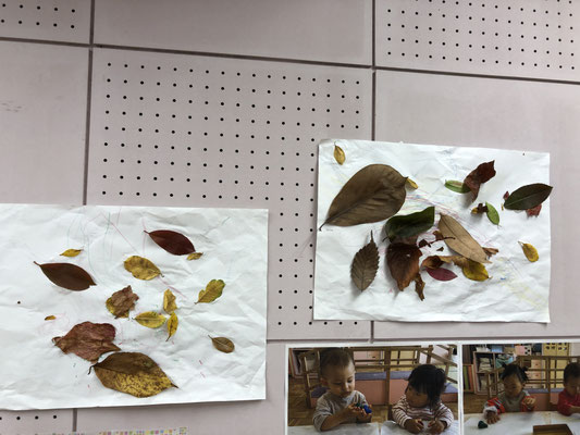 秋は、色とりどりの自然素材が溢れる「指先遊び」にピッタリの季節。みんなでお外に行って、色づき始めたたくさんの落ち葉を、見て・触って・集めました。