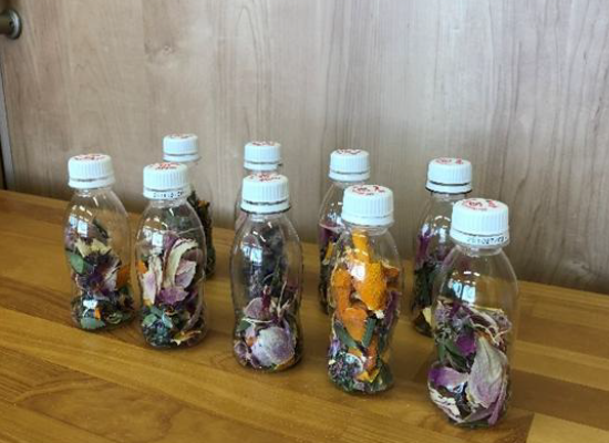 お部屋で乾燥させてみると、パリパリと、いつもと感触が異なることを発見!ドライフラワー・乾燥させたみかんの皮を容器に詰め、ポプリ作りを楽しみました。