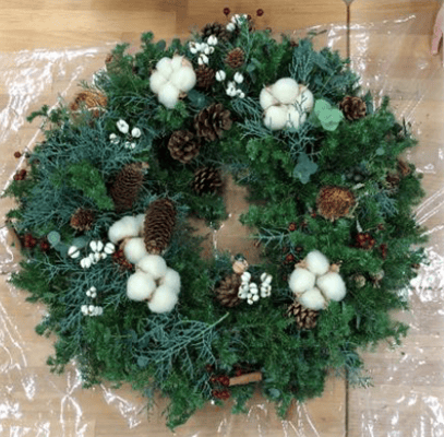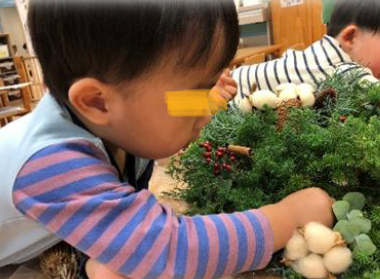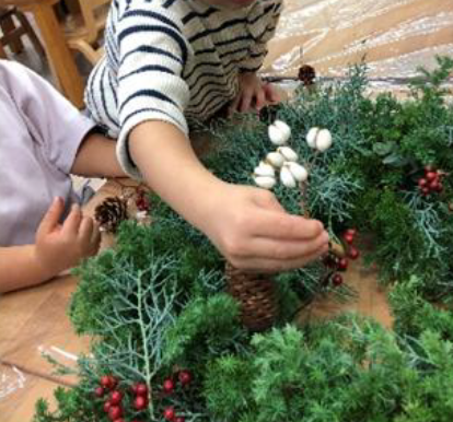 今年も、こどもたちは、園に飾る大きなクリスマスリース作りをしました。